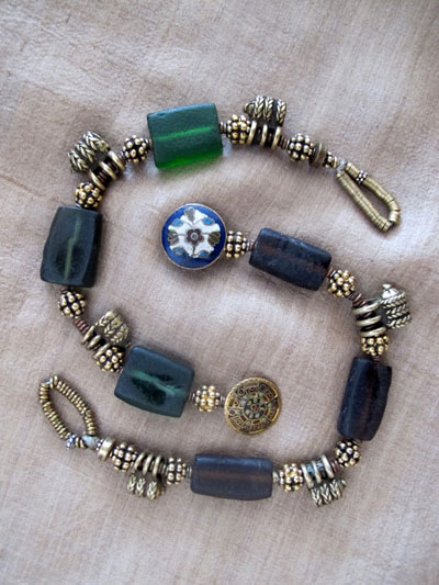 Nigerian Bottle Glass with old Orissa Bronze Beads from India, and Victorian Enamel Buttons